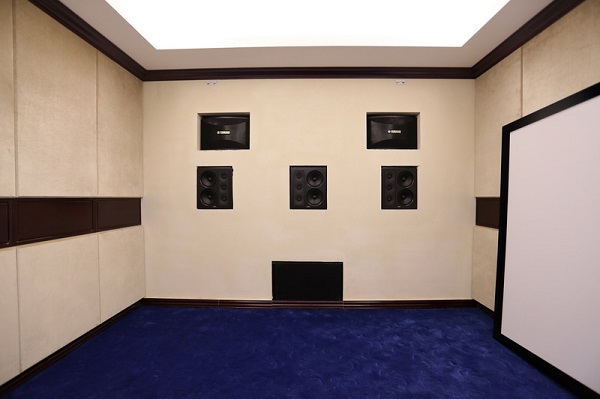 看过视听室后面,来看看前面的样子吧。由于视听室的面积有限,我们选择了前置扬声器隐藏式安装。业主选用了135寸透声幕,作为视听室的投影幕。为了要隐藏主音箱和卡拉OK音箱,在前墙做出一层假墙,当中放入吸音物料,再按照主音箱、卡拉OK音箱和低音炮的尺寸预留好孔位。把透声幕拿开后,可以看到三只M&K S300。