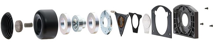 在中音单元和低音单元方面,Signature S8的阵容也是相当强大,低音部分一共用了4只7英寸低音单元,并以线阵形式排列,中音单元则使用1只7英寸中音单元。尽管口径相同,但振膜的材质有所不同。中音单元方面采用铝制振膜,磁钢为钕磁钢。低音单元用的是经过矿物涂层处理的PP振膜,同时该单元采用38mm口径的4层式长冲程音圈设计,用于提高低频能量输出。
