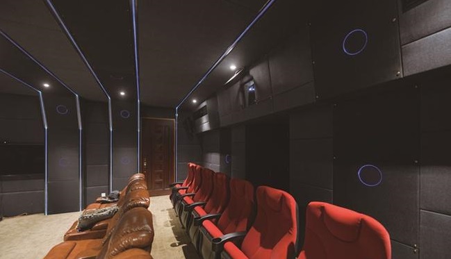 通风管的噪音怎么解决?首先,采用分体式空调,把产生主要噪音源的主机移到视听室外部,然后从主机引出来的通风管道口径均全部加大,以降低空气流速。同时,出风口的位置选择也非常特别,在前后排座位的阶梯上面,而且这个出风口被前排沙发遮挡起来,因此不会被发现,还能更进一步降低噪音。