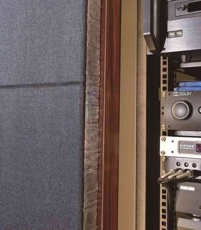 除了隔离来自影音设备的噪音源,对于该视听室的隔音方面,最主要的是处理好左右两堵门。解决的办法很简单,采用双层门结构进行隔离,同时门上面用的锁也是专门订购的滚轮锁,这种锁本身已具备隔音功能。