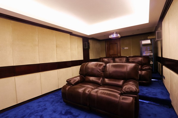 视听室以暖色系为主色调,奶咖色的吸音板和稳重的樱桃木饰面想结合,即起到了隔音处理效果又不失美观。宝石蓝的地毯搭配白色的地台灯带,为业主打造了一个高端且专业的家庭影院。