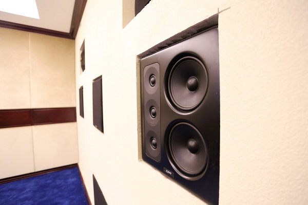 看过视听室后面,来看看前面的样子吧。由于视听室的面积有限,我们选择了前置扬声器隐藏式安装。业主选用了135寸透声幕,作为视听室的投影幕。为了要隐藏主音箱和卡拉OK音箱,在前墙做出一层假墙,当中放入吸音物料,再按照主音箱、卡拉OK音箱和低音炮的尺寸预留好孔位。把透声幕拿开后,可以看到三只M&K S300。